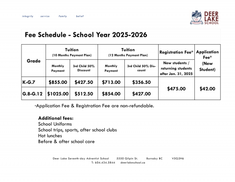Deer Lake School, in conjunction with the Seventh-day Adventist Church (BC Conference), issues tax receipts for part of the tuition as charitable donations. The charitable donations receipt covers the religious portion of the tuition, and it is calculated by deducting the secular portion from the total tuition paid. A receipt will be issued annually in February.